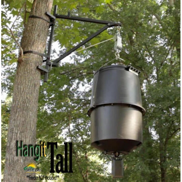 No need to search for a tree branch! The Hangit Tall can be set up on a tree trunk for temporary use at approximately 8 feet high or; with use of a climbing stick or ladder, can be set up for the season at any desired height. The Hangit Tall only weighs 14 lbs. and comes complete with a sturdy 400 denier carrying bag with a shoulder strap. With its aircraft aluminum construction and ratchet strap attachment system, the Hangit Tall has a whopping lifting weight limit of 250 lbs. Note: Feeder not included Made with Pride in the USA!