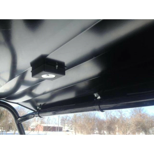 .100” Thick 5052 Aircraft Grade Aluminum. CNC Cut and Formed to ensure a perfect fit. Powder Coated Black for superior protection-The standard pictured is Gloss Black. Custom other colors are available but non-returnable. LED Dome Light Included. Front and Rear Gutters divert water to the sides. Mounts to your cage with Rubber Coated Straps. Made In Cleveland, Ohio.